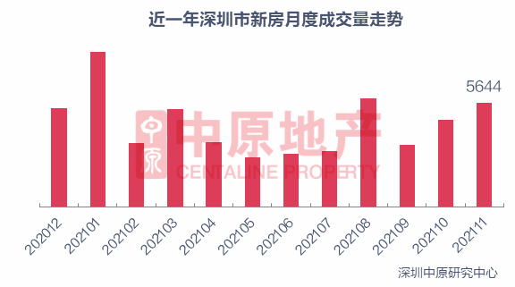 据中原最新数据统计,11月,深圳新房住宅成交5644套,环比上升19.8%;成交面积为55.6万平,环比上升14.5%。