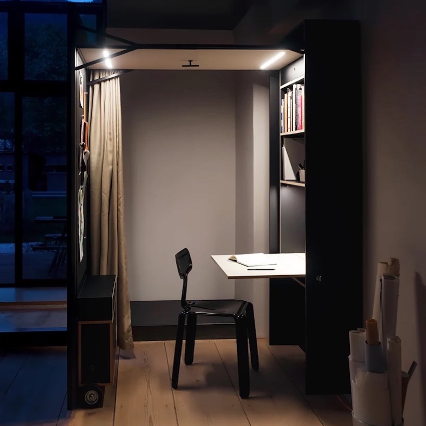 团队利用剪刀式结构折叠天花板和滑轮,进而敞开工作区面积,灯光一并整合于天花上,更利用后墙添入磁吸留言板,前方摊展一面层柜,柜内从铅笔、书籍、电线至电子产品,任何所需收纳皆透过线槽与沟缝有序布局,使之齐备工作、阅读时所需机能,俐落框起一方高效的工作区域。