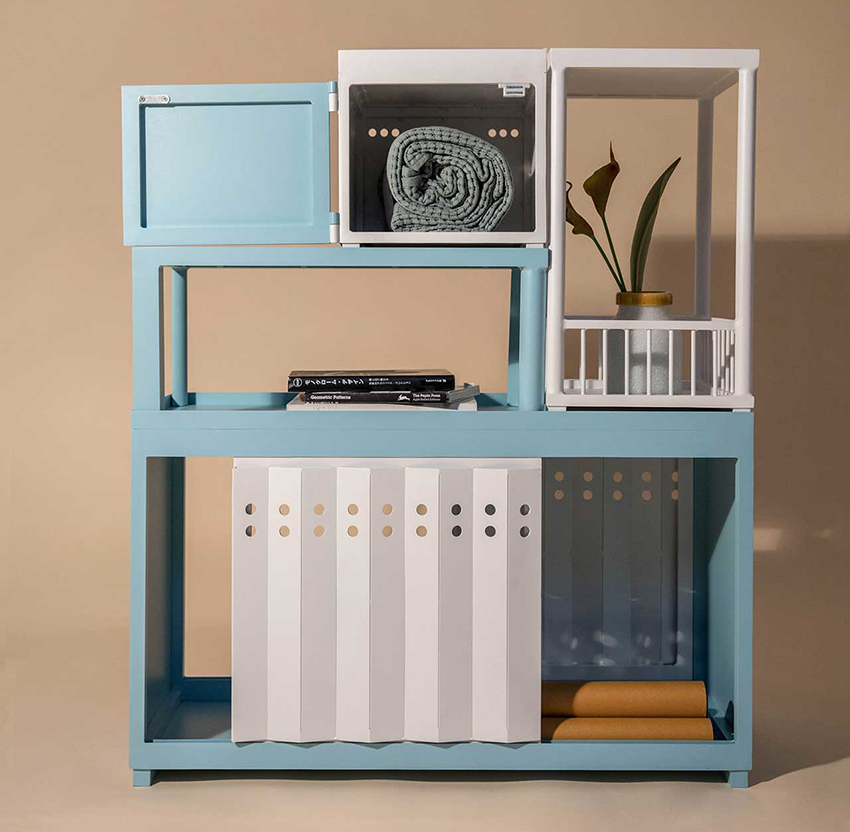 Tenement H 以白色、红色和蓝色等三种鲜艳配色诠释了曼谷意象,铝制柜身可自行堆叠配置,使其相容于不同大小空间中,为小坪数时代带来更大弹性。