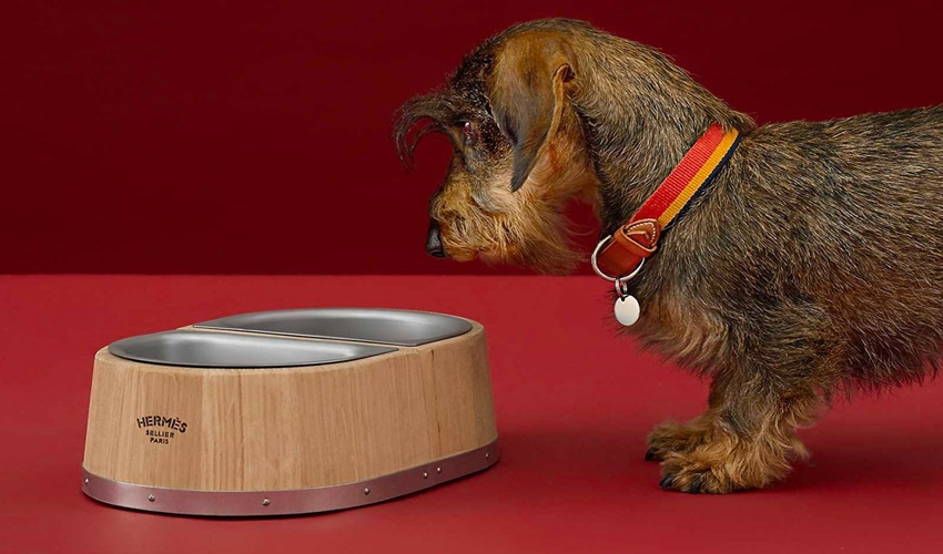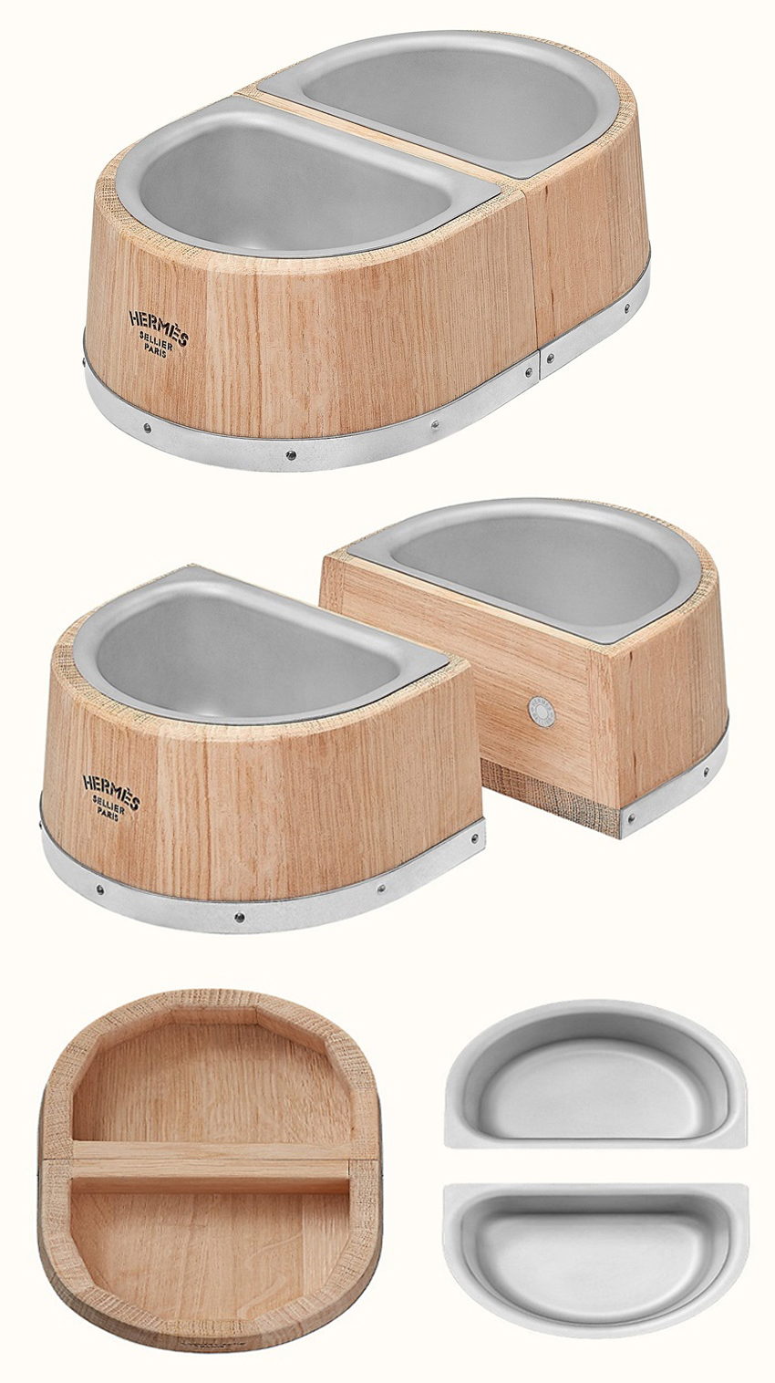 爱马仕为宠物推出了精致的“小号宠物餐碗”(Dog bowl, small model),由高质感、耐用的橡木与不銹钢所打造,并按照传统的桶形工艺制作,设计灵感来自爱马仕第 4 代传人 Robert Dumas 所设计的 Chaine d'Ancre 船锚炼,餐碗透过中央的磁铁,可以一分为二,拆分成为两个独立的碗,合并使用便成了 Chaine d'Ancre 经典图案。