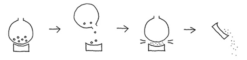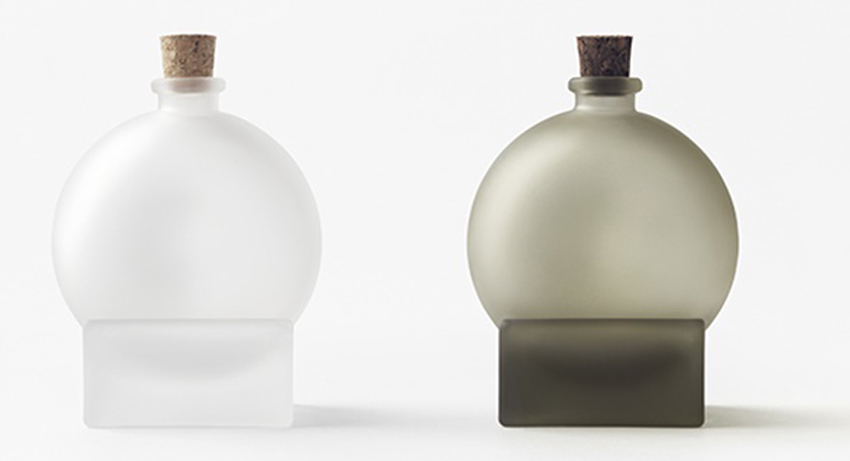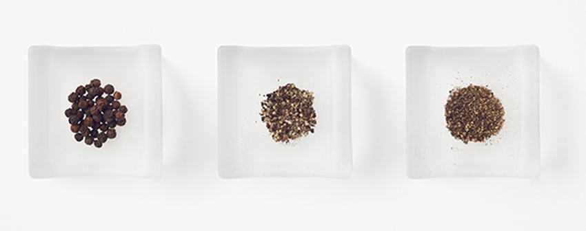意象取自古法,但设计却很新颖,设计师采用雾面玻璃打造壶身、底座,圆壶底部带有棱线纹路,只要取下软木塞,倒出盐粒或胡椒粒到玻璃凹槽底座,再用壶底与底座相互辗磨的方式,就能轻松磨碎颗粒了。