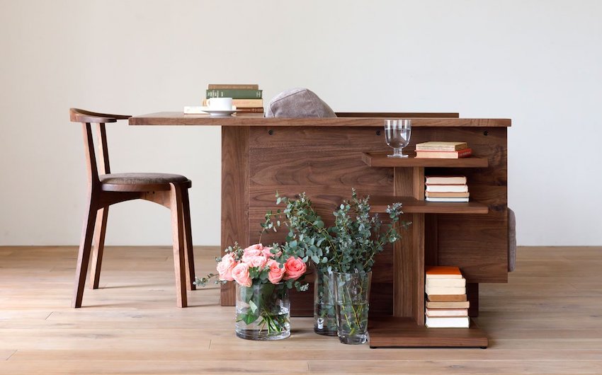 延伸自沙发扶手,流畅推开软垫背后桌台,桌下更拓出一排书柜,使个人书籍收藏成为布置元素,更是这件家具迷人的设计环节之一。