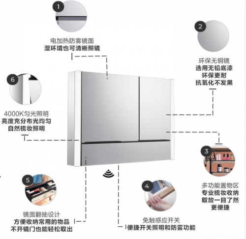 特别设计的便捷翻抽结构,让常用的化妆品和保养品触手可及。无需打开整个镜门,轻轻一拉即可取出所需物品,大大节省了早晨匆忙中的宝贵时间。这一贴心设计,让梳妆台上少了杂乱,多了从容。镜柜内嵌的LED照明系统,采用4000K自然色温,均匀照亮每一寸肌肤,为梳妆过程提供专业级的辅助。无论是日常妆容还是特殊场合的精致装扮,都能在这柔和而真实的灯光下完美呈现,帮助用户捕捉最真实的自我。