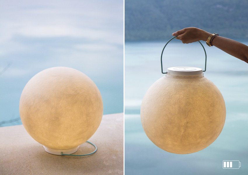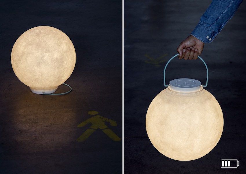 Luna Take Away 以 Nebulite 玻璃纤维仿造月球凹凸面,营造柔光晕散效果,并在充饱电后,平均可续航 8 小时(视不同亮度而定)。