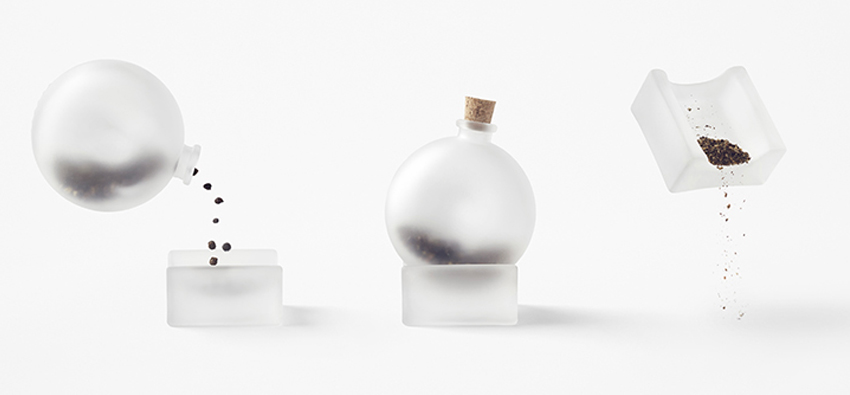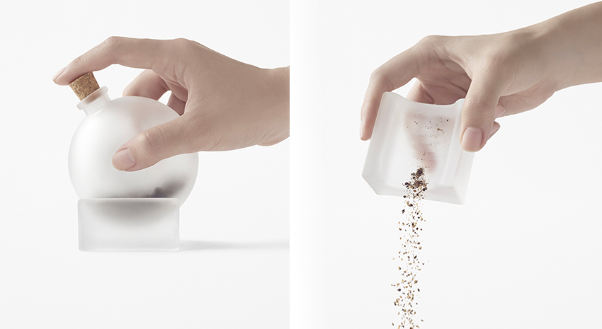 意象取自古法,但设计却很新颖,设计师采用雾面玻璃打造壶身、底座,圆壶底部带有棱线纹路,只要取下软木塞,倒出盐粒或胡椒粒到玻璃凹槽底座,再用壶底与底座相互辗磨的方式,就能轻松磨碎颗粒了。